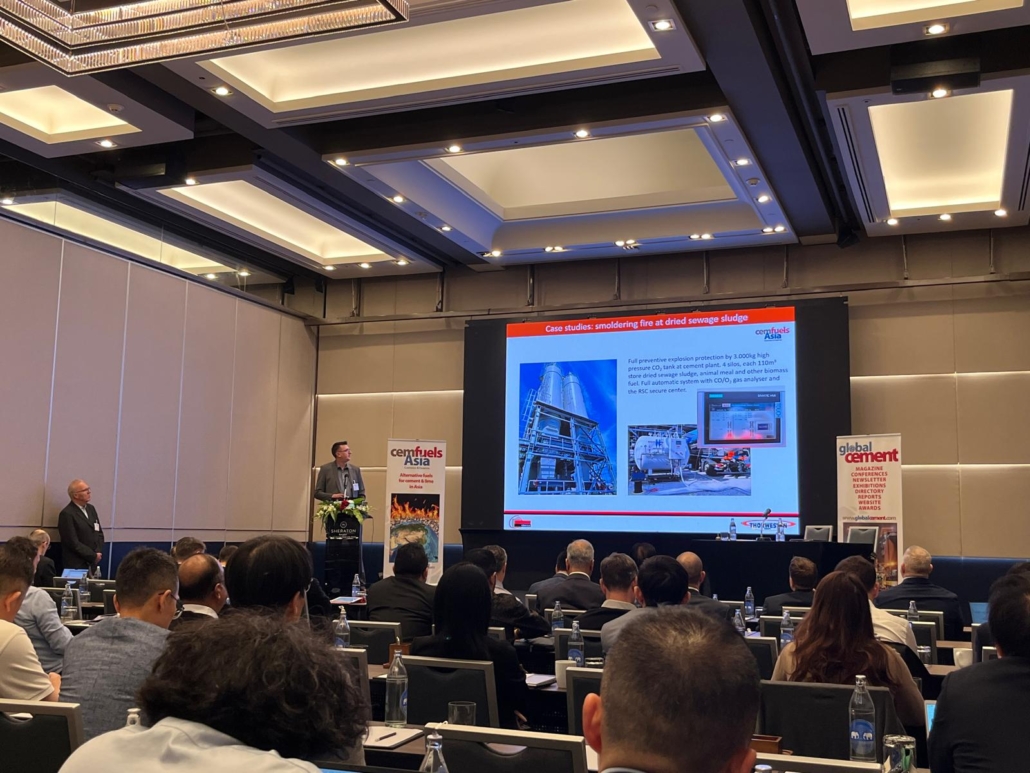 The first presenters on the second day of the con-ference were Christian Fink from robecco and Berthold Bussieweke of Thorwesten Vent, who spoke about safe handling and storage of AF and coal (coal still being a main fuel in Asia). Berthold suggested that silos should be vented by means of self-re-closing explosion venting devices, to avoid secondary explosions. Christian then suggested that inert gases can prevent the occurrence of the criti-cal parameters that lead to explosions or fires in AF and coal. Explosions cannot happen at an oxygen concentration of less than 8%, while smouldering or glowing fires are extinguished by reducing the oxy-gen concentration to less than 2-3%. It is important to have enough inert gas to be able to purge the at-mosphere in the vessel in question two or three times over, and within 30-60 minutes. Ideally, the inerting process should be triggered automatically with sen-sors, rather than relying on the actions of the central control room. Both presenters underlined the fact that sewage sludge, animal meal and other biomass fuels are potentially dangerous materials – and that care must be taken when handling and storing them.